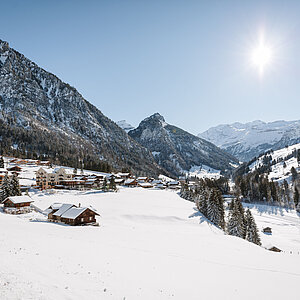 Winterlandschaft mit drei schneebedeckten Chalets umgeben von einem Arvenwald und imposantem Bergpanorama. ©  (c) Sven Allenbach / Tourismus Adelboden-Lenk-Kandersteg